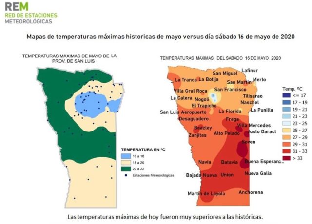 Anoche desde la REM distribuyeron un mapa comparativo, que ilustra nuestra nota, donde se pueden observar las temperaturas históricas y la comparación con el día 16. Sorprende observar los altos registros en todo el territorio de San Luis.